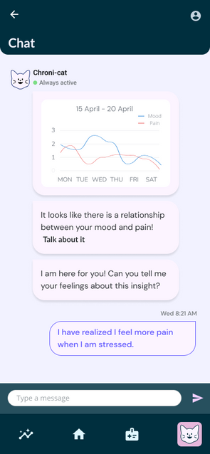 Accordingly, we decided to design Chroni-Cat; an application that supports multimodal input including speech-to-text, picture, calendar and click input, while providing gamification to motivate users to engage and reflect on their health journey.